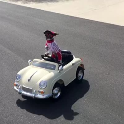 A dog stands on its back legs while it drives a power wheels toy car in the road.