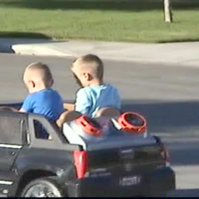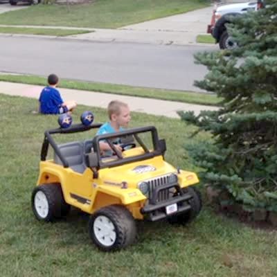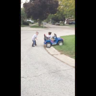 2 young boys ride around street in a Power Wheels car. 1 boy gets out & walks in front of car, gets run over. No tails.