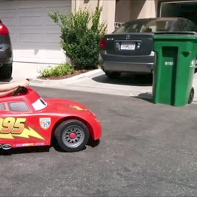 A tot boy drives a power wheels toy car in the driveway and then skids to parallel park between two trash cans. Then it plays again in slow motion.
