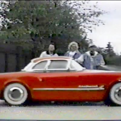 Car emerges from a large leaf pile and drives into the backyard. Leaves, autumn.