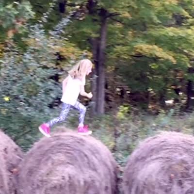 A young girl runs over bales of hay. She trips, lands on her stomach and gets stuck between two bales.