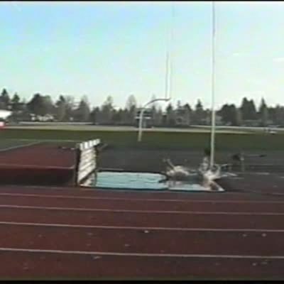 Man jumps over a hurdle, hits hurdle and falls in water on track.