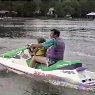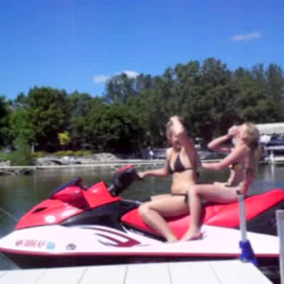 Teen girl in a bikini sits on jet ski on lake. Another girl hops on and they hit heads.