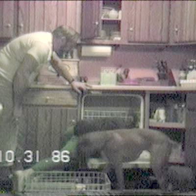 Woman gets stuck in dishwasher (Runner). Date on screen 1986.