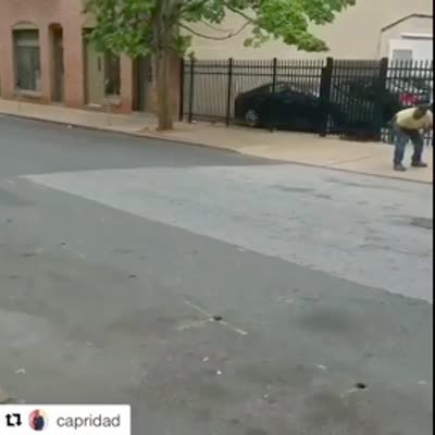 A young boy runs and lifts himself off of a treadmill at a high speed, then when he steps down he flies off the back.