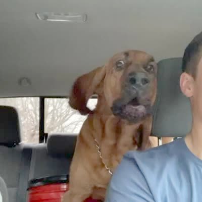 A woman sits in the front seat of a car tells the man driving, "don't roll the window down." A dog in the backseat takes issue with this and howls loudly.