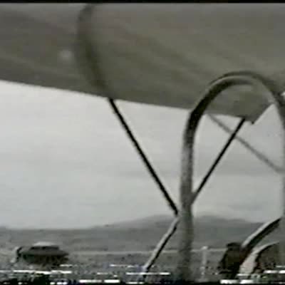 Two men sail on a sailboat on a lake when one man attempts to hang on the boom (he's attached to the sail by a cord/rope). The man falls and gets dragged in the water behind the boat by his lifejacket.