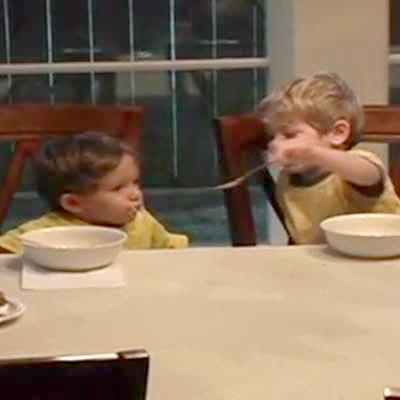 "Soup Spittin' Sibling" 2 tot boys share their food at the table, then tot boy on the left spits into the other boy's bowl. Gross.