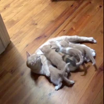 Kitten cats nurse on their mom and push her across a wooden floor.