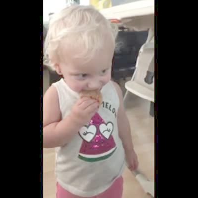 "The Cupcake Kid" Tot boy has two cupcakes, one with bites taken out of it and the other without. Tot offers his dad the cup cake with the bites missing. Dad says he'd rather have the one with no bites. Tot takes bite out of that cupcake and offers it to dad.