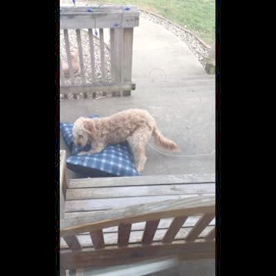 A cat lays on a pillow on the porch and a dog grabs the pillow and flips it over and puts it on top of the cat and lays down on it.