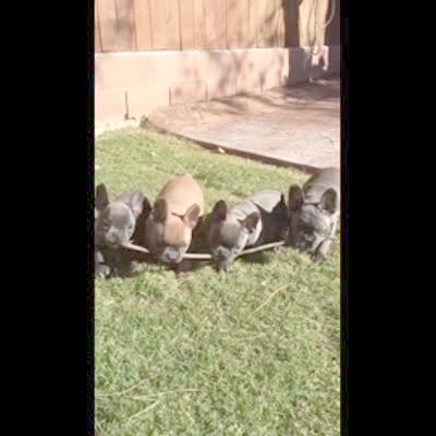 Four puppy dogs hold onto the same stick while they walk around the yard together.