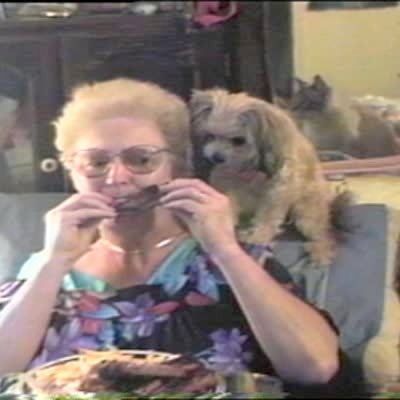 A man eats spaghetti, a dog sits on his lap and eats the bits of spaghetti that dangle from the man's mouth until their mouths meet like Lady and the Tramp. His wife films and laughs.