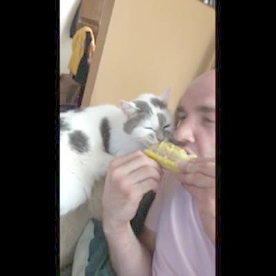 A cat eats corn on the cob with a man as he sits on the couch in the living room.
