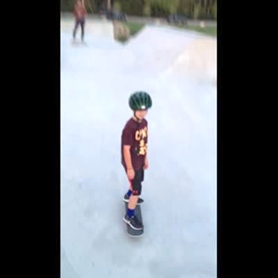 A young boy rides a tricycle down a ramp at a skate park and crashes. His mom laughs, and he shouts "that's not funny!"