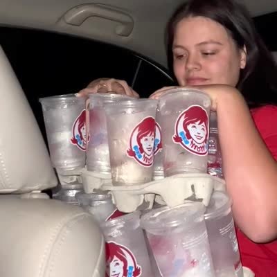 A teen girl is in the backseat of a car holds in her arms several cups of water in takeout containers. The car goes over a speed bump and the girl falls forward and every cup loses its lid and spills water on her.