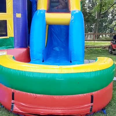 A young girl in her backyard goes down an inflatable waterslide. She accidentally goes over the barrier and falls on the ground.