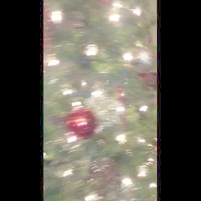 A boy screams that he is scared while a man holds him up to put the star on a Christmas tree at home.