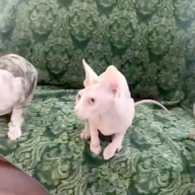 Three hairless cats move their heads side to side in unison as they follow a cat toy and it looks like they are dancing to the music.