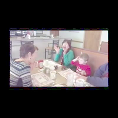 A teen girl shoots a straw wrapper at a boy across a restaurant table when the wrapper sticks in his ear in slow motion and their family laughs.