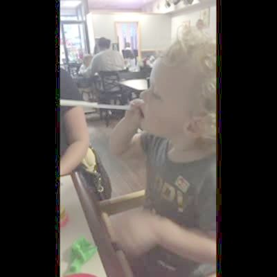 A baby boy laughs as a woman blows a straw wrapper at him in a restaurant and then the wrapper goes in his mouth and he gags.
