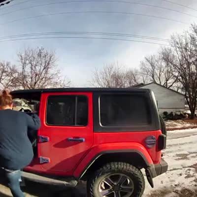 A young boy opens the trunk of an SUV in a driveway, when he gets lifted from the ground and taken up with it. As he dangles from the back, his grandma comes and helps him down. Security footage.