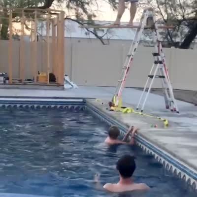 While she tries to help her husband with construction on the patio roof, a woman climbs up a ladder and loses her balance. She falls to the ground and rolls into a swimming pool. Security footage