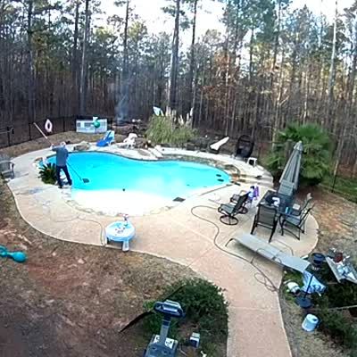 A woman cleans her in-ground swimming pool in her backyard. She falls through a trapdoor in the deck. Security footage.