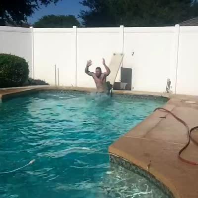 A man attempts to do his "famous butt dive," but as he attempts to bounce off of the diving board, it snaps and topples over him in a swimming pool.