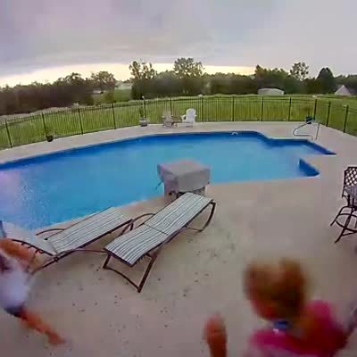 Three women run outside onto a pool deck to fetch a kiddie-pool out of a pool. Lightning and thunder occur close-by and the three women turn around and run inside. Security Footage.