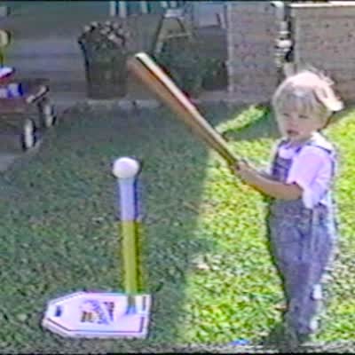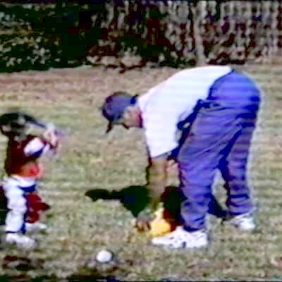 Grandpa / senior man gets beaned when kid hits baseball with bat. (t ball)