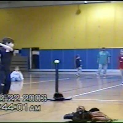 A tot boy learns to hit a t-ball with a bat indoors. When his teacher tells him to keep his "eye on the ball", he actually tries to put his eye onto the ball.