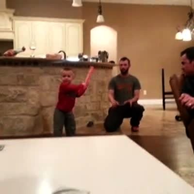 A young boy in his house pitches a baseball. A teen boy bats and hits a clock which falls off the wall and breaks.