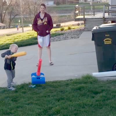 A young boy with a bat swings at a plastic baseball on a Tee. He hits the ball, and the ball hits his father, a young man, in the groin, as his dad stands in front of him. No heads