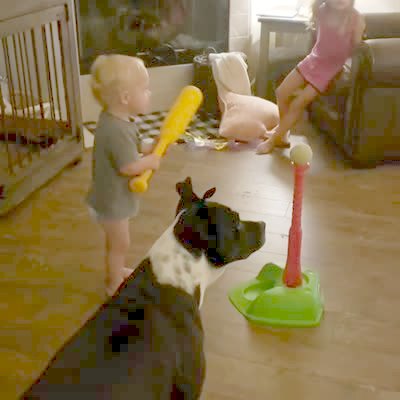 A dog takes a ball off of a tee before a tot boy hits it in a living room.