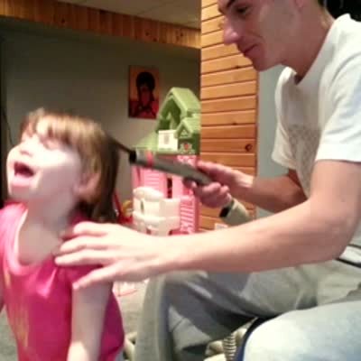 A man gives his tot daughter a ponytail by vacuuming her hair in a hose, sliding a hair tie down the tube and turning off the vacuum.