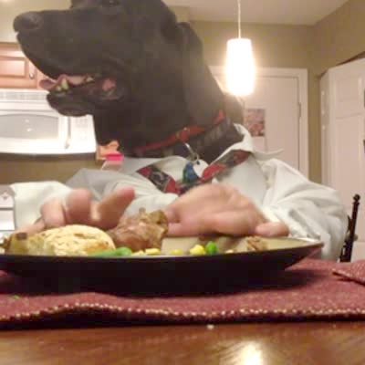 A black lab dog wears a shirt and tie with human hands and eats food at a table before he takes it to go indoors.