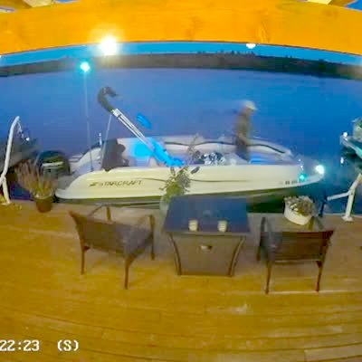 A woman on a boat leans on a pole to get up, then the pole suddenly bends and she falls into the water in a dock. Security camera footage.