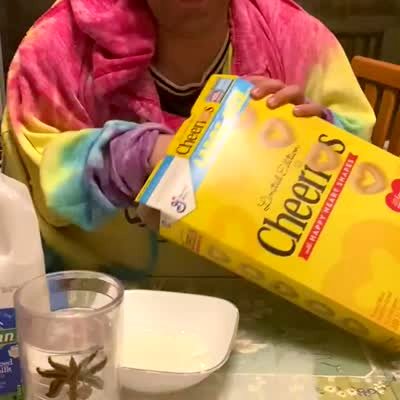 A man does the Borrowed Hands challenge with a young boy's arms. He tries to make a bowl of cereal but spills the milk all over the table, and then he eats a fried egg with his hands.