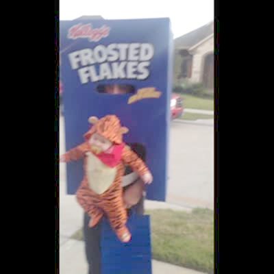 A baby wears a tiger costume while strapped to their dad, who is dressed as a Frosted Flakes cereal box to go trick-or-treat on Halloween.