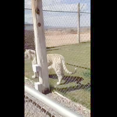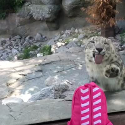 A cute snow tiger licks the glass while reaching for a pink backpack on the other side at a zoo. A man and his tot girl taunt it. No audio.