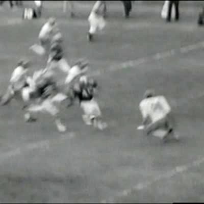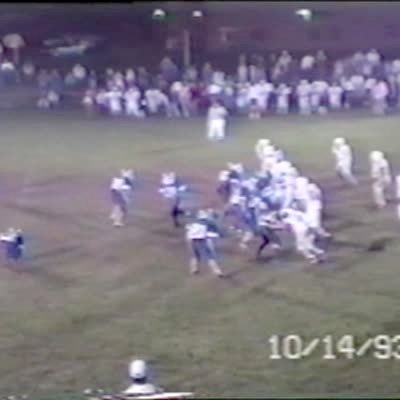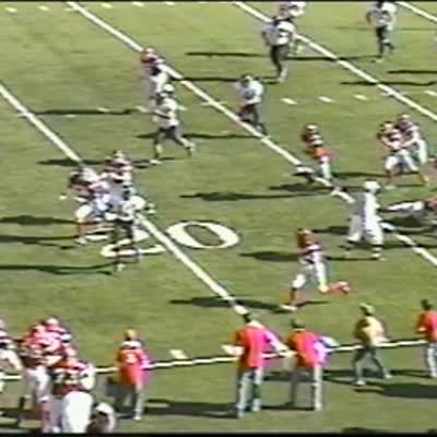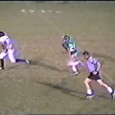High school football running back breaks through pileup, runs for touchdown, gets pants grabbed/pulled down by other player.