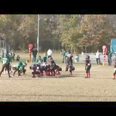 A young boy runs down the football field with the ball. The other boys try to stop him but he pushes them away like they're nothing and gets a touchdown. Featured talent cleared (the boy who scores the touchdown).