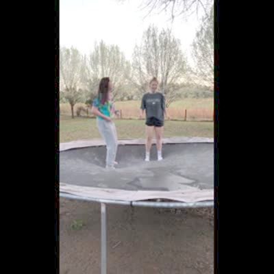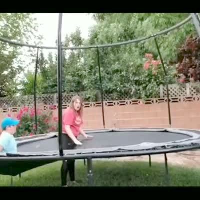 A young boy and girl jump around on a trampoline while a woman watches their tricks. The woman hands the camera to a young girl so she can show them her trick. The woman bounces and lands on her bottom the first time. The woman repeats the same move but when she lands on her bottom the second time the trampoline splits and the woman falls through. The woman laughs while she sits on the ground with her head above the split in the trampoline.