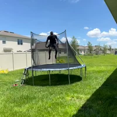 A man stands on a ladder to flip over the frame of a trampoline. The man pushes the trampoline and falls off the ladder. Music rights not cleared.