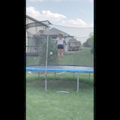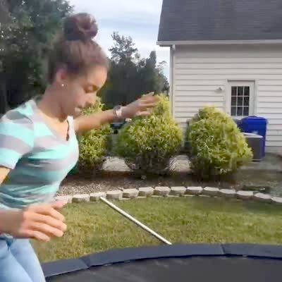 A teen girl does two backflips on a trampoline in slow motion. On the second backflip, the girl lands on the edge of the trampoline and falls off.