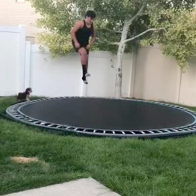 A teen boy jumps on a trampoline in a backyard. A puppy dog runs onto the trampoline. The boy starts to flip and somehow catches the dog in his arms.