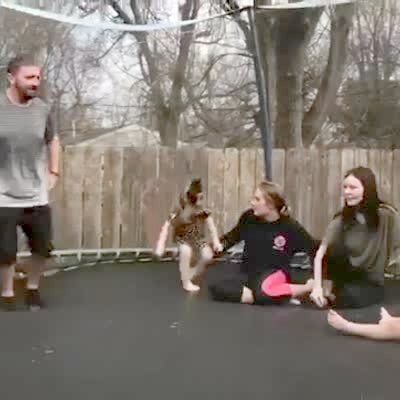 Two teen girls and a three tot girls watch a man bounce and flip on a trampoline in a yard and the trampoline breaks and he falls through.
