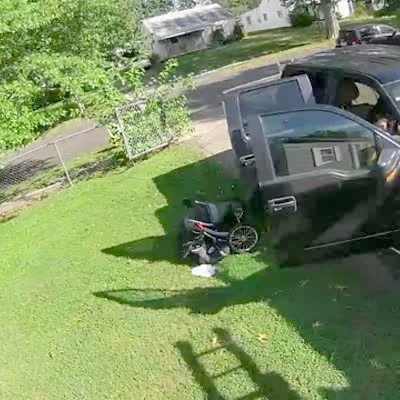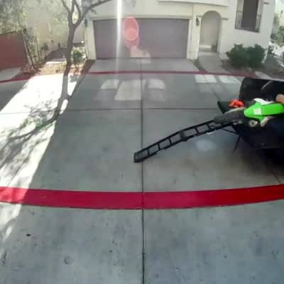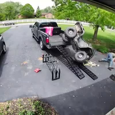 A man attempts to reverse his four-wheeler from a trailer onto the back of a truck when one of the ramps falls and he and the four-wheeler topple off to the driveway. Security footage.