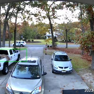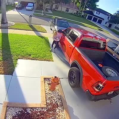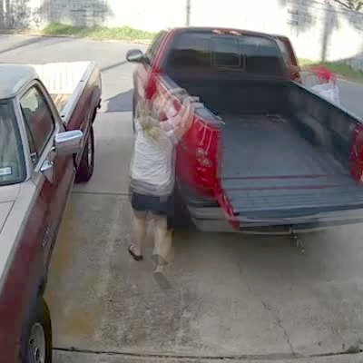 A woman pulls into a driveway in a truck. She gets out of the truck and the truck rolls back across the street and hits a tree. She runs after it. Security footage.